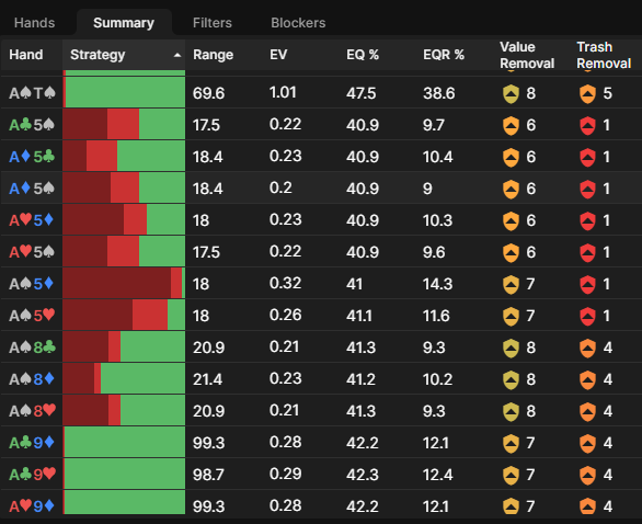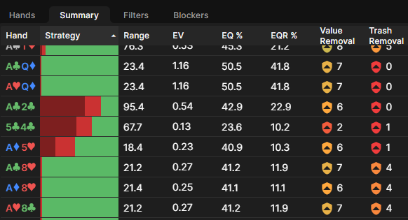 ניתן לשים לב שהסולבר מעדיף לשמור (בעיקר להשוות וגם קצת רייזים) בעיקר את אלו עם 8 ו-9, אילו ידיים שיש להם גם backdoor לסטרייט ואקוויטי מעט גבוה יותר מיתר הקומבינציות.