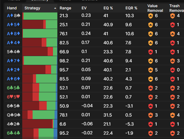 גם אם נבחן את חלוקת טווח ההגנה להשוואה ורייז כנגד הימור של 1.5BB, הממוצע בספוט הזה הוא שמתוך 88% טווח הגנה יש להשוות עם כ-67% ולבצע רייז עם כ-21% אך כשבוחנים את הפלופים השונים ישנם פלופים בהם נבצע רייז לעיתים רחוקות מאוד: