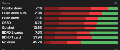ראשית, מבחינת תדירות ע"פ הסולבר טווח הצ'ק שלנו צריך לכלול 40% מהידיים שלנו. המשמעות היא שאנחנו צריכים להוסיף לטווח הצ'ק בעיקר עוד ידיים בינוניות, עוד קצת ידיים חזקות וגם עוד קצת זבל. בנוסף בפלופ הזה יש המון ריצות לסטרייטים ולצבע וצריכים לאזן את הריצות בין הטווחים. כך נראית החלוקה בסולבר מבחינת אקוויטי: