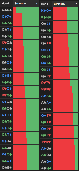 ללא ספק כול הזוגות הללו נחשבים כזבל אך אנחנו רואים העדפות ברורות של הסולבר לפעולות שונות עם קומבינציות שונות. בקצה אחד של הסקאלה זוג חמש ללא לב ביד מעדיף צ'ק ובקצה השני של הסקאלה זוג 2 עם לב ביד מעדיף רייז.