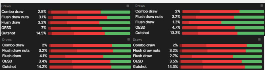 כל משבצת מייצגת את כל הקומבינציות האפשרויות של אותה יד ולכן חשוב להתבונן בתדירות הספציפית של כל קומבינציה. למשל הפלופ הספציפי הזה הוא Kh8d3c ואם נבחן את המשבצת של A9s נראה שיש הימור עם 60% מהפעמים אבל כשעושים דריל דאון ל4 קומבינציות הספציפיות רואים הבדל גדול בין אלו עם backdoor flush draw לבין A9s: