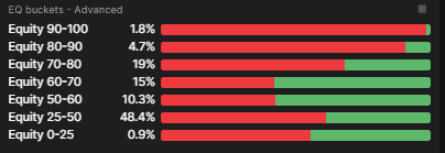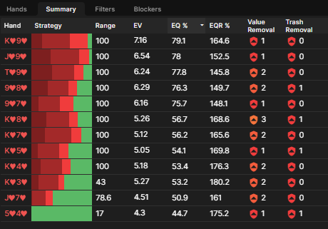 בסולבר ניתן לחלק את כל הידיים לדליים של אקוויטי ולראות בצורה גרפית את תדירות ההימור/צ'ק של כל דלי כזה, כך למשל זה נראה בהימור המשך בפוזיציה על לוח של K88 כאשר יתרון ברור לטווח שלנו: