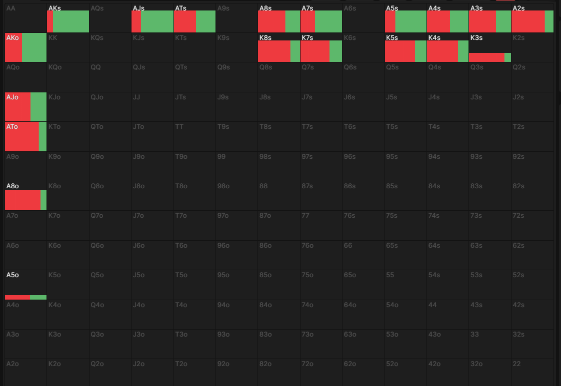 פתרונות סולבר אינם לידיים ספציפיות. כלומר אפשר להוציא פתרון לידיים ספציפיות אך בגדול הסולבר נותן פתרון לטווח ידיים שלם שאיתן נגיע לספוט הספציפי אותו אנחנו רוצים לבדוק. כל הידיים שאינן מושחרות אלו הידיים בטווח שלנו שאיתן הגענו לספוט הזה. בתוך כל משבצת יש סימון לפעולות שלנו בצבעים שונים: ירוק משמעותו צ'ק, אדום משמעותו הימור והגוונים של האדום מצביעים על גובה ההימור. משבצות שהן בחלקן שחורות לגובה מצביעות על כך שלא כל הקומבינציות של היד הזו הגיעו לפלופ, אם נזכר בטווחי ה-RFI שלנו בשלב הפרה פלופ אז ישנם ידיים כמו זוגות נמוכים או suited connected נמוכים שאנחנו נפתח איתם קופה רק בחמישים אחוז או 70 אחוז מהמקרים. שימו לב שבסולבר הזה הטווחים ל-HJ מעט שונים מהטווחים שפירטנו בפוסט על הפרה פלופ אבל כפי שגם ציינו בעבר לסולברים שונים יש פתרונות מעט שונים ובכל מקרה ההבדלים לא מהותיים.