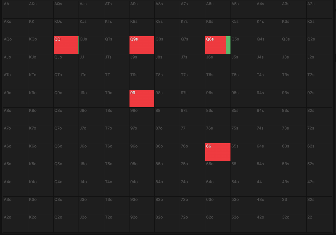 במרבית הפלופים בפוזיציה אנחנו נצטרך טווח צ'ק שכולל בין 25-45% מהידיים שלנו ופה זה כבר נהיה מורכב יותר. נקח למשל את הדוגמה המושלמת לפלופ דינמי Qh9s6h ונפרק את הטווח של CO vs BB לכל חלקיו.