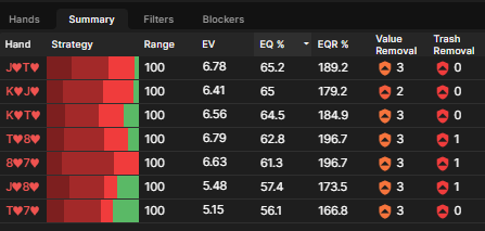 אנחנו רואים שתדירות ההימור הגבוהה ביותר שמורה לידיים שיש להם גם Back Door אקוויטי עם שני עלים או JTo עם לב אחד. בהתאם לכך תדירות ההימור עם יתר הקומבינציות של JT יורדת. כלומר השיקול בריצות הללו הוא לא רק לפי אקוויטי, שהרי ל-JTo בלי לב יש אקוויטי גבוה יותר מ-78 עם back door flush, אלא גם התחשבות ב- Implied odds וגם בבלוקרים שמובילים לכך שה-EV שלנו עם 78 עלה הוא 3.77 בליינדים ואילו ה-EV של JTo בלי לב ביד הוא 3.52 וכך ידיים אלו הופכים להימור יותר רווחי.