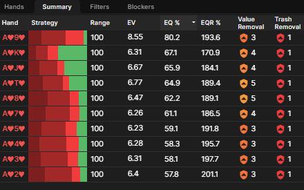 אנחנו רואים למשל איך שילובים של A8,AT,AJ מהמרים בתדירות גבוה יותר מאשר AK, גם אלו ידיים עם פחות showdown value ואאוטים להשתפר וגם חוסמים טוב יותר את טווח ההמשך של היריב. אם נכנס לקומבינציות הספציפיות איתן הסולבר מעדיף להמר נראה גם נוכחות גבוהה של לבבות: