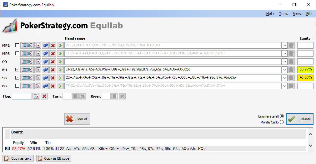 עכשיו ניקח את שני הטווחים האלו ונריץ אותם אחד כנגד השני באמצעות תוכנות Equilab, תוכנה חינמית נהדרת לבדיקת אקוויטי של יד מול יד, טווח מול טווח או יד מול טווח. אלו התוצאות בקרב שבין הכפתור ללימפר:
