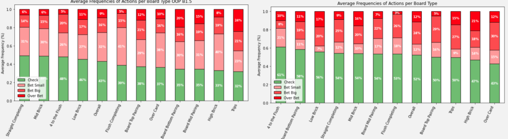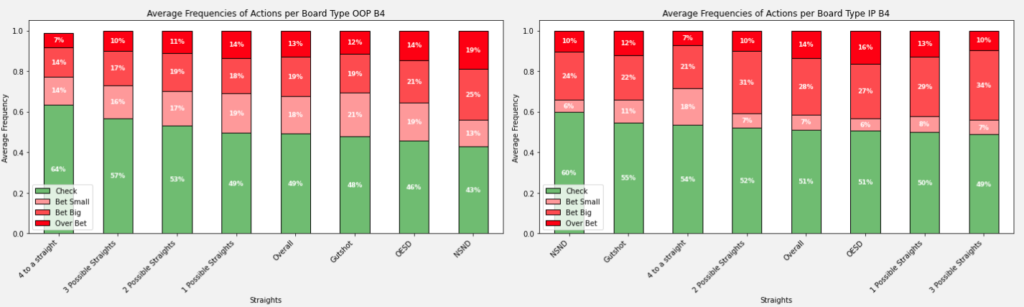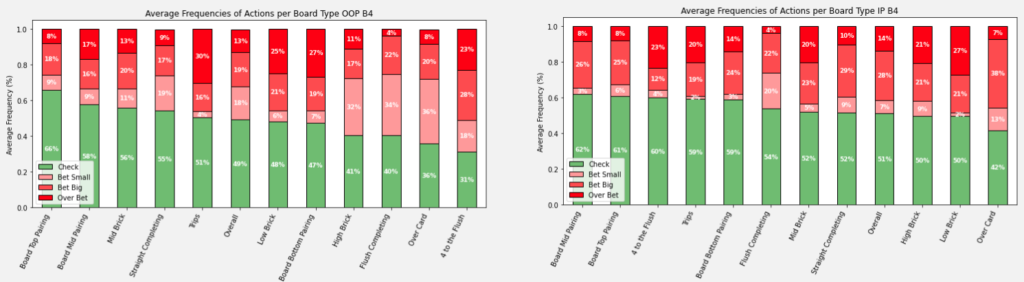 כעת נרחיב מעט על ניתוח דפוסי ההימורים בלוחות השונים ועל פי סוג קלף הטרן. לכל ניתוח יש 4 גרפים, אחד לכל ספוט. הנתונים משמאל תמיד יהיו מחוץ לפוזיציה ומימין מפוזיציה. תמיד נראה את הנתונים של הליין של הימור נמוך בפלופ ולאחר מכן את הנתונים עבור ליין של הימור גבוה בפלופ.