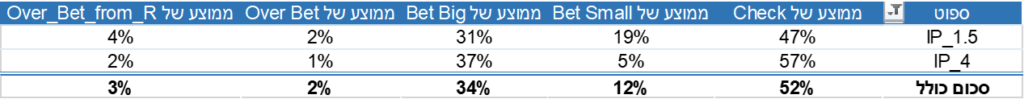 למרות שכיסינו כבר את הנושא אני מרגיש צורך לחזור ולחדד כמה דברים. בפוסטים הראשונים התבססנו על סאבסט של 25 פלופים שונים וכל קלפי הטרן האפשריים, בעקבות שדרוג יכולות כריית הנתונים שלי ומעבר לסאבסט של 184 ידיים יש באפשרותנו לנתח את הנתונים יותר לעומק ולחלץ יותר תובנות. במיוחד מעניינת אותי הנקודה מתי להשתמש ב-Overbet בהימור המשך בטרן וההבדלים במשחק מפוזיציה ומחוץ לפוזיציה.