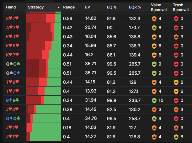 יש פה כמה קומבינציות ספציפיות שעולות לי תהיות לגביהן ולא ממש ברורה לי הבחירה של הסולבר (למשל להמר בגדול עם KQo או לצ'קצ'ק עם יד כמו K6s שכבר אפשר להגדיר כיד זבל) אך אנחנו לא נתעכב על קומבינציות ספציפיות במקרה הזה שכן בתדירות הימור כל כך גבוהה מלאכת הרכבת הטווח היא דיי פשוטה וגם אם נסיט קצת צ'קים או הימורים מיד ליד ההבדל יהיה זניח.